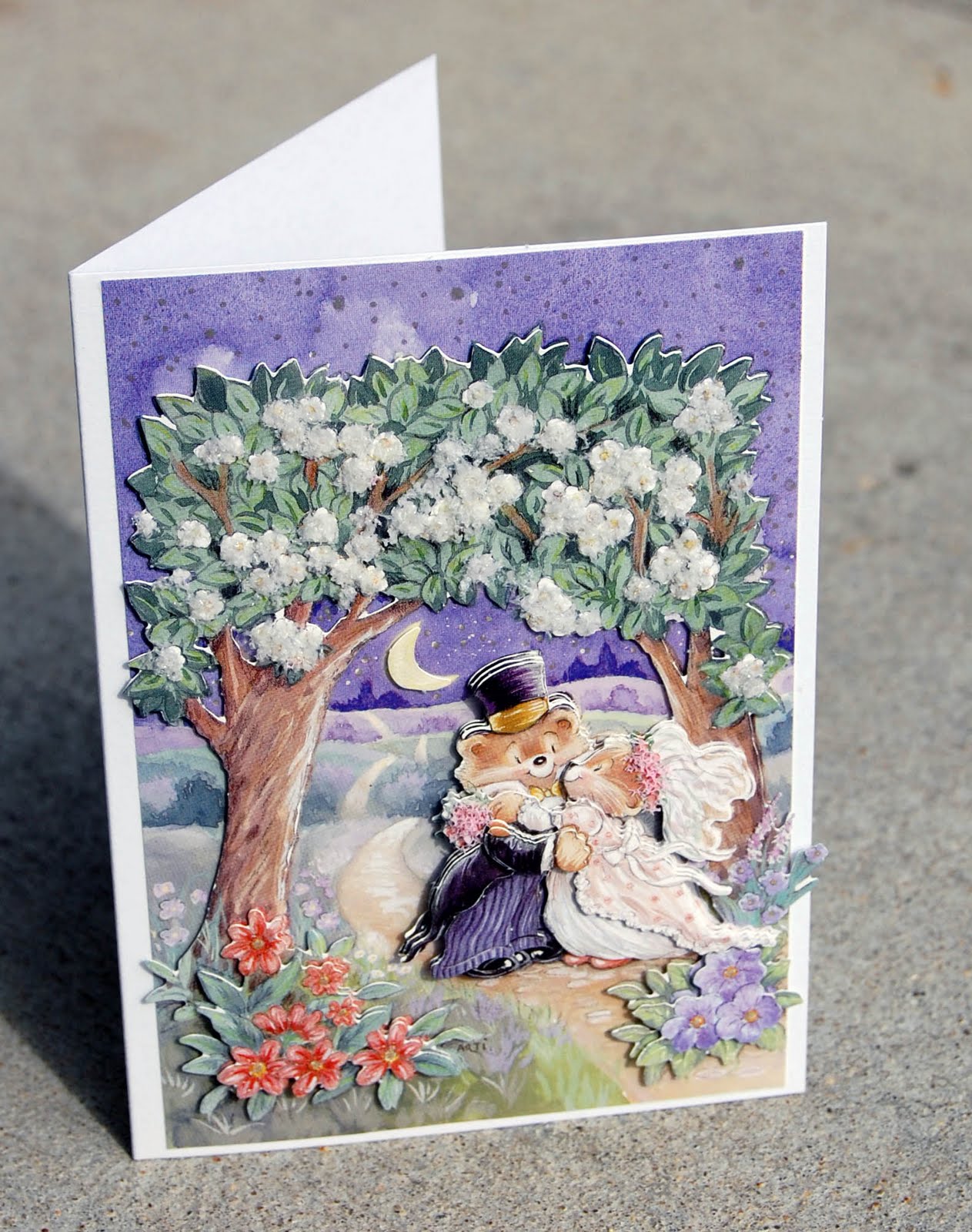 For today's project I decided to show you that you can use other images besides the Flower Soft Toppers with your Flower Soft. I chose to make a card with one of the three adorable images from the Wedding Bears & Cats diecut set from Ecstasy Crafts. Here's a look at my finished card: