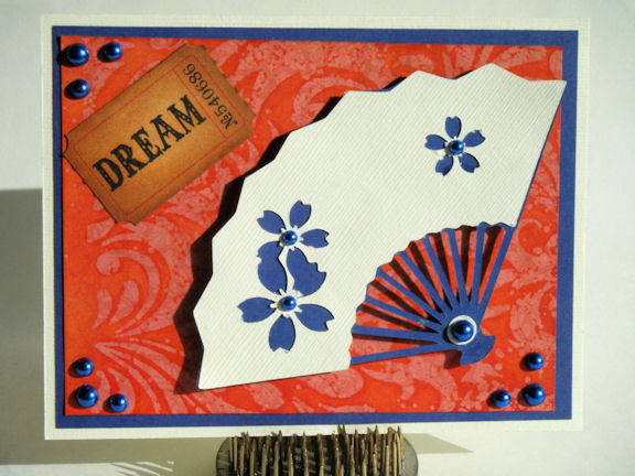 To finish my card, I cut a fan from the Cricut Pagoda cartridge (yes, Kim can special order this for you, just ask) at 3". I added it to my card front with some foam tape. Then I took a Tim Holtz ticket that said Dream and inked it with some Tea Dye and Vintage Photo distress ink ad added it to my card. Finally I added some dark blue pearls from my stash. Kim has a wide selection of pearls in multiple colors and sizes here in the store.